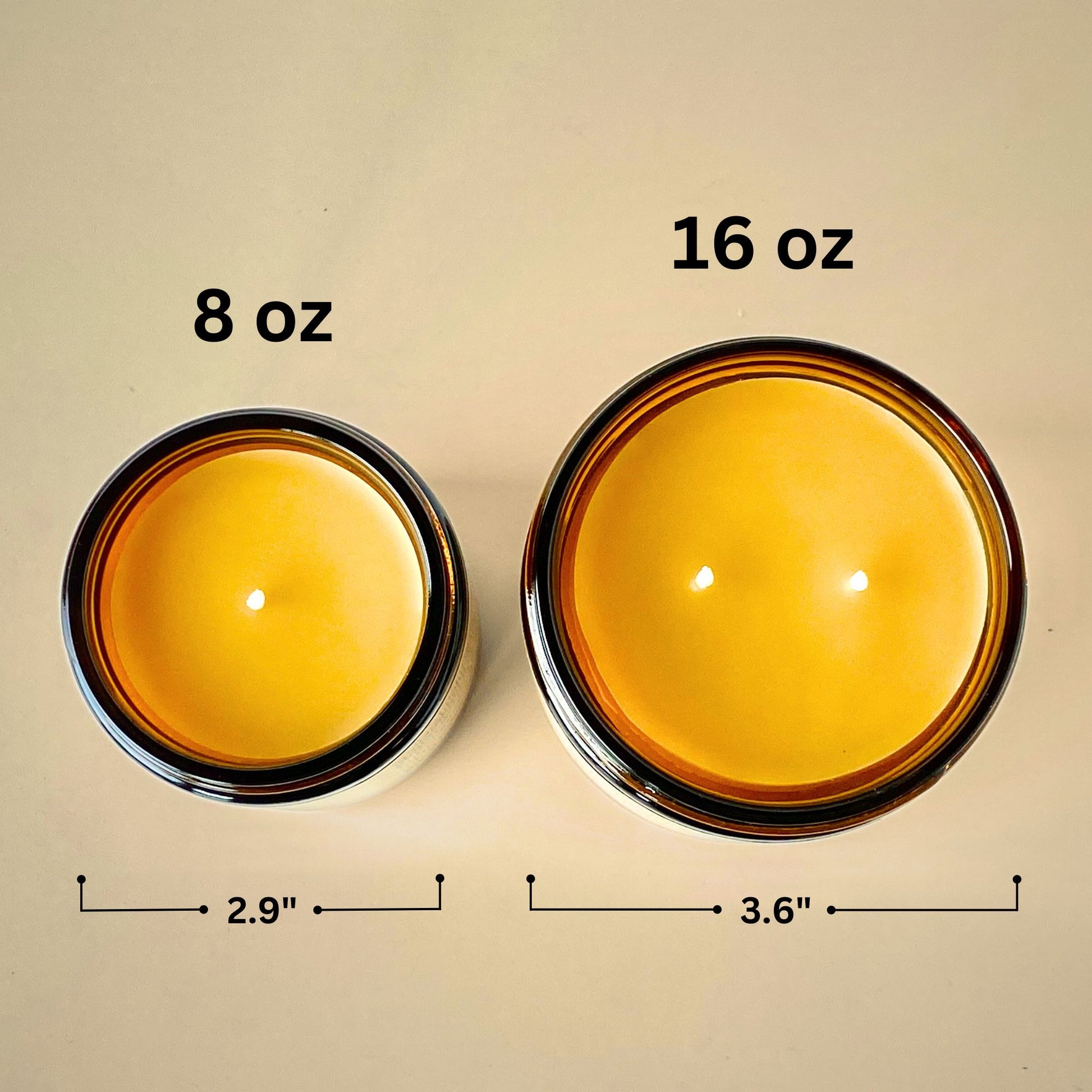 - 16 oz: 4” x 3.5” x 3.5” | 2 wicks | burns up to 60 hrs