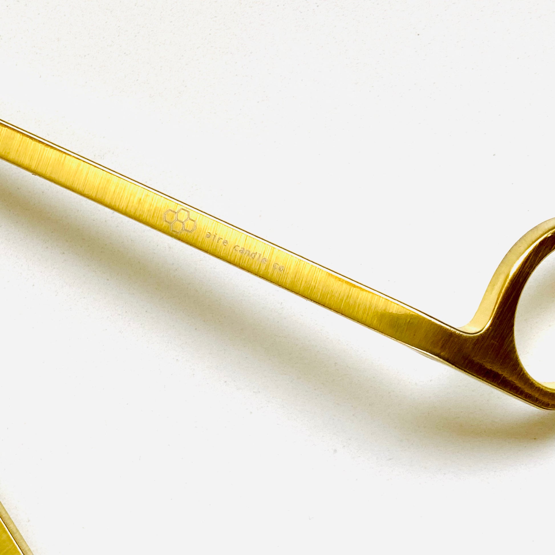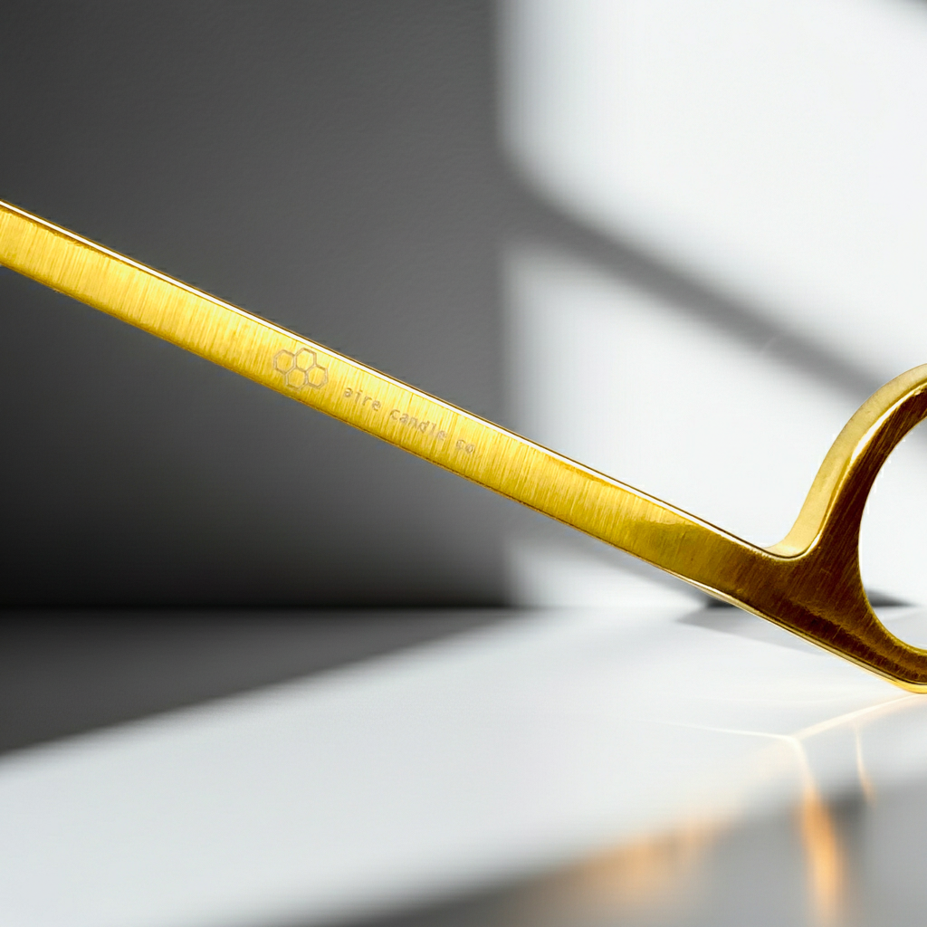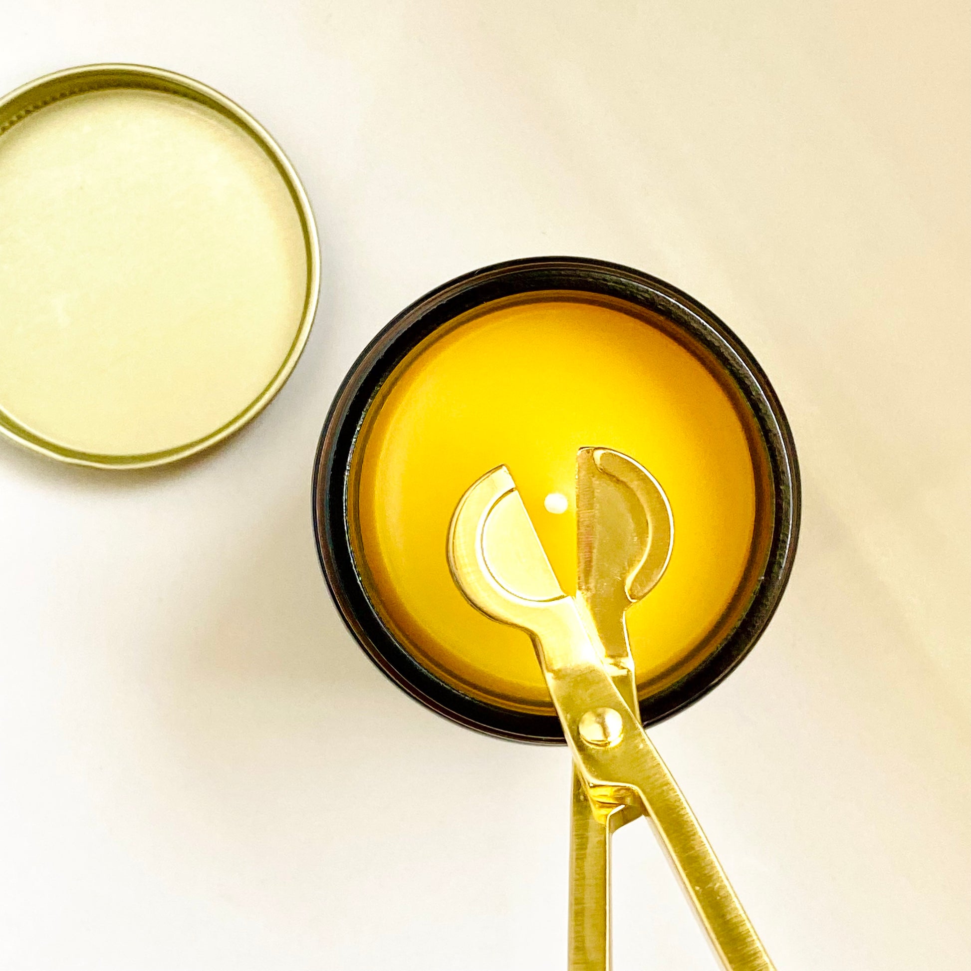 - Place the trimmer's long handle against the inside of the jar's rim for guidance and bring the curved scissor blades to the wick, about 1/4" from the base and parallel with the wax.